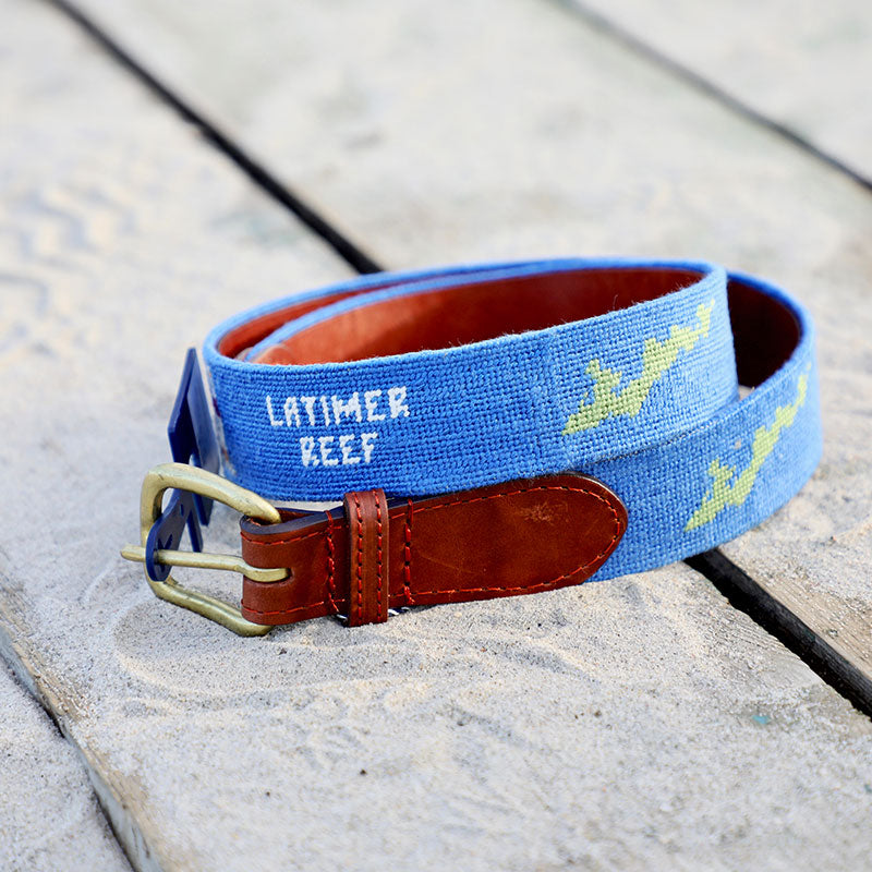 Hand-stitched traditional needlepoint belt, finished with Italian leather and a solid brass buckle. This custom design made by Smathers and Branson features Race Rock, Ledge Light and Latimer Reef. Only available at The Beach Plum. (Limited Quantity)