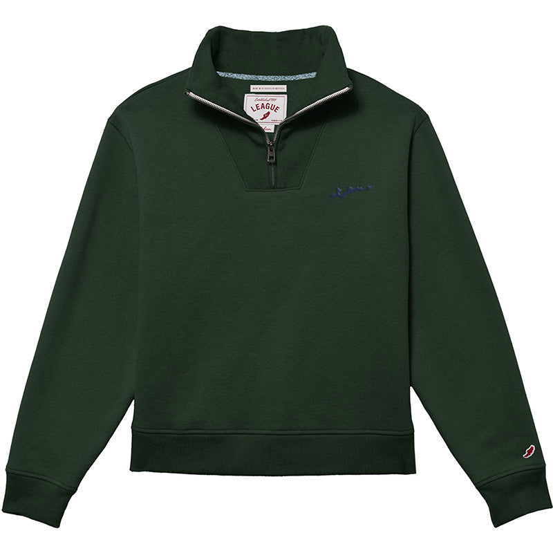 Return of a classic favorite! Perfect for running errands or playing pickleball. The fold-over rib knit collar creates such a standout look from all other quarter zips! Hunter w/ Navy Island on Left Chest.