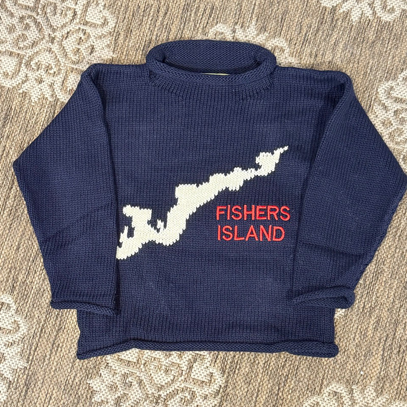 Custom cotton sweaters made by Claver. Navy and white with red stitching.